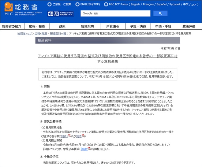総務省は3月17日に「アマチュア業務に使用する電波の型式及び周波数の使用区別を定める告示の一部改正案に対する意見募集」を報道発表した