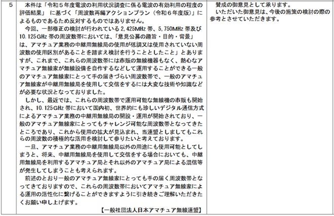 公表された意見募集の結果(一部抜粋)。JARLは改正に賛成する意見を提出していた