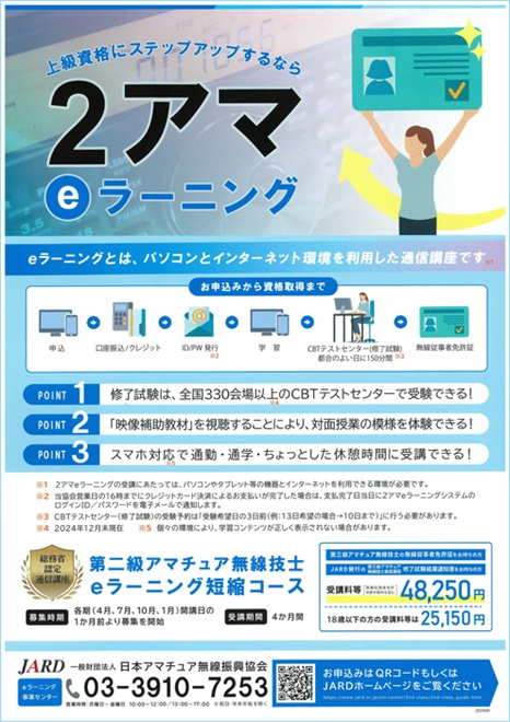 JARD(一般財団法人 日本アマチュア無線振興協会)は、3アマから2アマへステップアップできる「2アマeラーニング養成課程」の2026年度1月期の受講者を、12月1日(月)から18日(木)まで募集すると発表した。