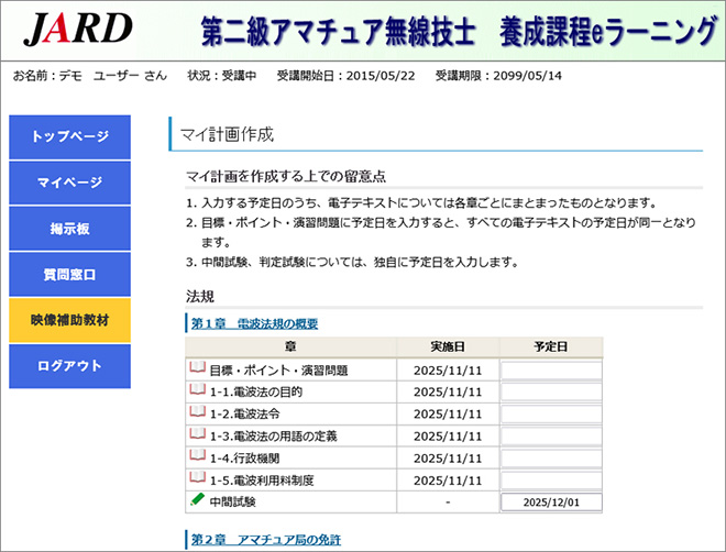 このeラーニング養成課程では、受講者がインターネットに接続したパソコンやスマートフォンを使い、受講者専用ページにある電子テキストや授業動画などを使って、法規(全7章)と無線工学(全13章)を学習していく。