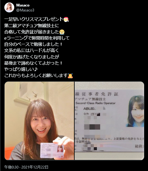 JARDの2アマeラーニングを受講し、無事に2アマの無線従事者免許証を取得したことを報告するMasacoさんのX(旧Twitter)より(2021年12月22日)