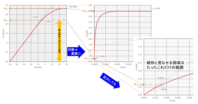 図1は第13話でPSATとP1dBの解説に使用したデシベル表記の増幅器入出力特性図を真数グラフに書き換えると、どのように見えるかを示したものです。