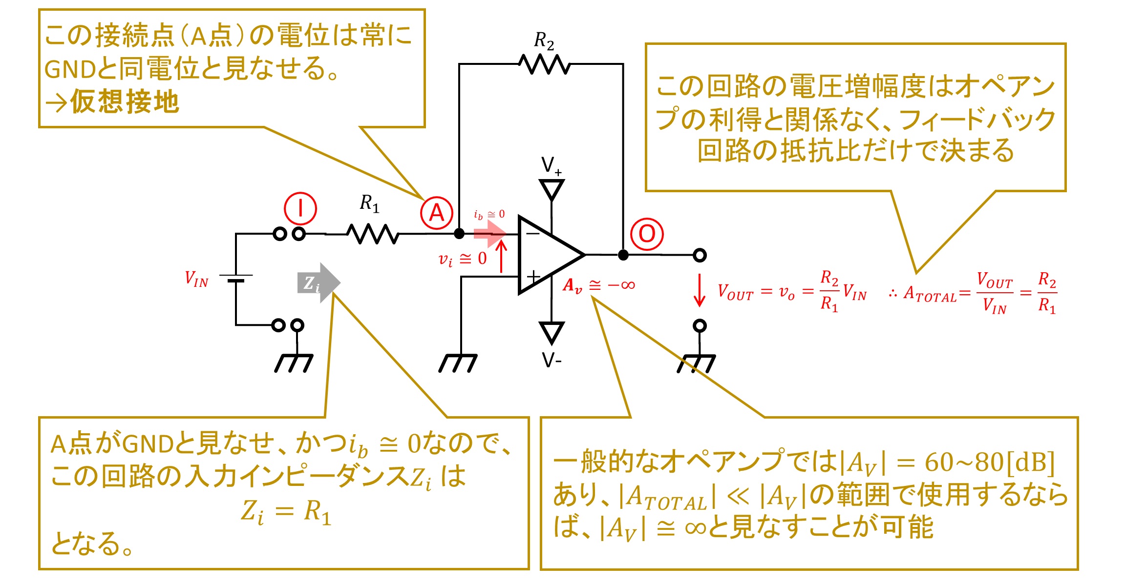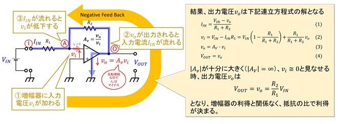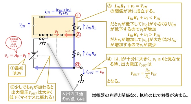 R1 とR2 で負帰還回路を構成しています。回路の入力に電圧VIN が印加されると、R1 を介して増幅器の入力に電圧