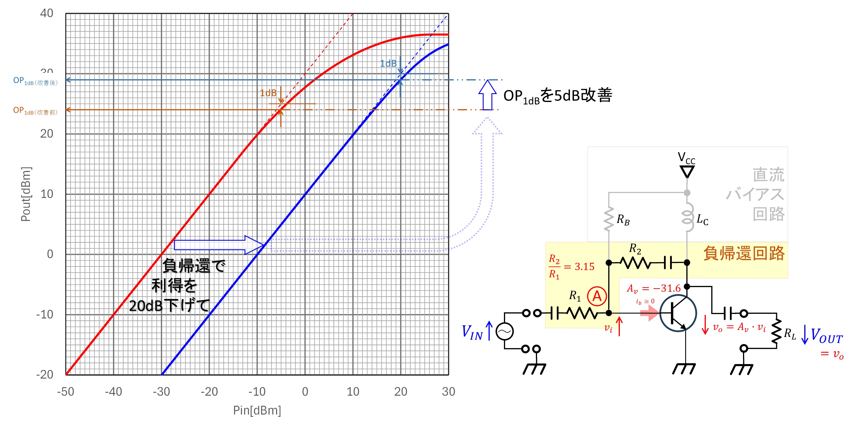 図から判るように利得の小さい増幅器でも、負帰還を行って増幅器単体利得AV の1/10程度の回路利得ATOTAL で使用することにより、回路のP1dBを5dB程度改善することが出来ました。但し効果は限定的といえます。このように負帰還回路による直線性(歪み)の改善は、増幅器の利得を大きく下げて利用する、言い換えると裸の利得が大きい増幅器でなければ大きな効果は得られないという本質的な問題を抱えています。また増幅する信号の振動周期(周波数)に対して、帰還回路の遅延時間が無視できなくなると、負帰還回路が負帰還にならずに回路動作が不安定になります※1。このため無線通信用の高周波増幅回路では、発振防止目的の位相補正を除き、このタイプの負帰還回路はあまり利用されません。