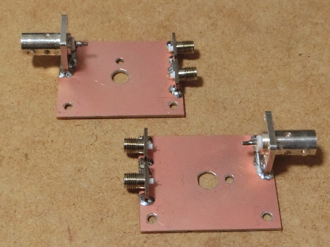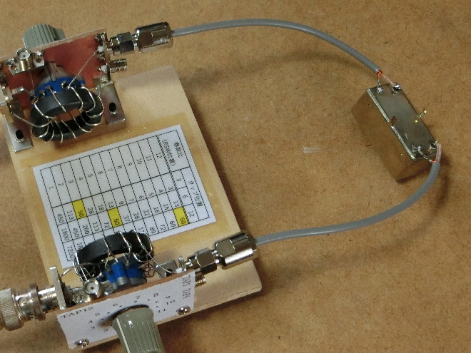 クリスタルフィルタへの接続部分も大切です。もちろん、いい加減では入出力間で結合してしまい、測定結果に影響します。写真7と写真8のようにSMAコネクタを使っています。とは言え、SMAコネクタへの配線はもっと短くするべきです。作ってみないと解らない立体的な部分で、かなり曖昧で理想とは思えません。このようなSMAコネクタではなく、同じSMAでも正方形の方が多少作りやすかったと思います。