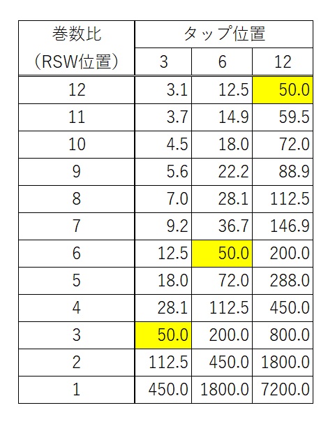 なお写真6には表3が貼ってあります。これはフルバージョンの表2から、実際に使ったタップ位置だけを取り出したものです。測定に使う時にはこの方が使いやすくなります。値が一桁になると小数点以下が気になります。表3には小数点一桁まで入れていますが、写真6は前のバージョンで入っていません。まあ、あまり細かい数値には意味が無いとは思います。