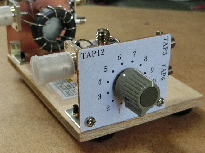 ロータリースイッチを固定するため生基板を写真5のように加工し、スペアナ用のBNCコネクタとフィルタ用のSMAコネクタをハンダ付けしました。写真では解りませんが、裏側だけハンダすると強度がとれません。多少表側にもスペースをとってハンダしています。実は組み立ててから位置的に問題がある事に気が付き、SMAコネクタはもう一個追加しました。そのためタップの取り出しが3か所になりました。最初は2ヶ所で充分と思っていました。