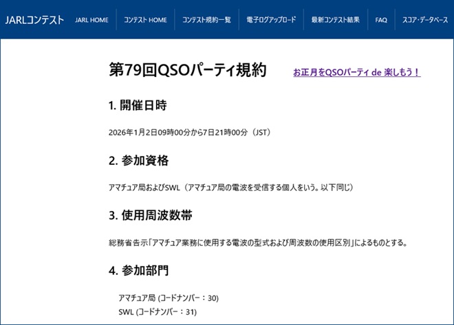 では、2026年の正月に開催される「第79回 QSOパーティ」の概要をJARLコンテストページからの抜粋で紹介していこう。