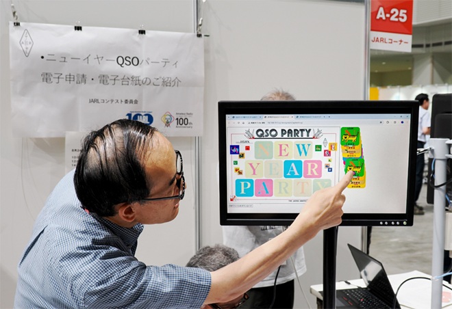 「ハムフェア2025」会場でJARLコンテスト委員会による電子ステッカー・電子台紙のデモンストレーションが行われた