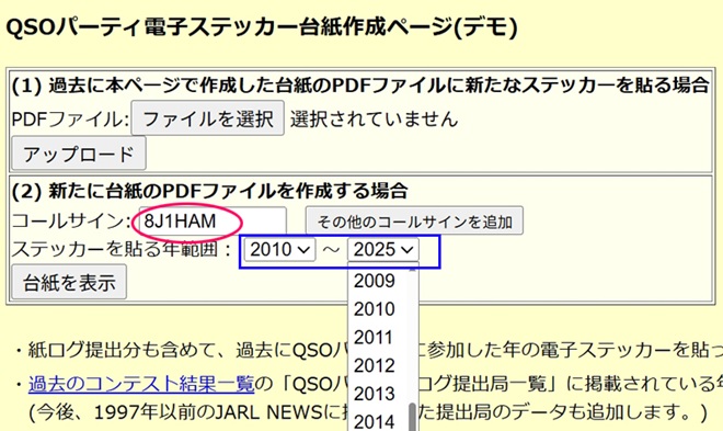 自局のコールサイン(体験用として8J1HAMでも可)を入力し、ステッカーを貼る年範囲を選択