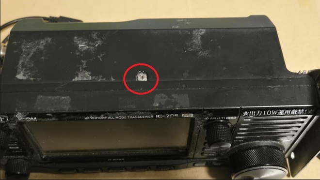 山手線駅前QRV時に使用していた筆者が製作したカーナビ用サンシェードを加工したものはフックと両面テープで固定し、使用しないときはディスプレイを保護する蓋を兼ねていましたが、今回購入したアイコミック705サンシェード・I705SSはマグネットでIC-705天板の鉄ビスに固定でき、使用しないときは容易に脱着できる仕組みになっていました。