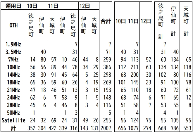 運用日、QTH、バンド別のQSO数を表1に示します。3日間(運用開始から終了まで約48時間)で2,000QSOを達成しました。特に、28MHz帯で好調だった時間帯がありました。50MHz帯はダイポールアンテナでの運用だったため、本土への直接波伝搬には力不足で、5QSOに終わりました。