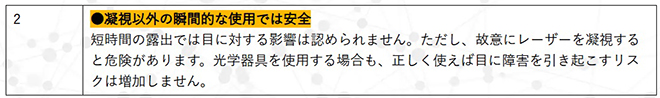 日本産業規格(JIS C 6802)、レーザークラス分類による安全基準において本実験ではクラス2のレーザーモジュールを使用しています。