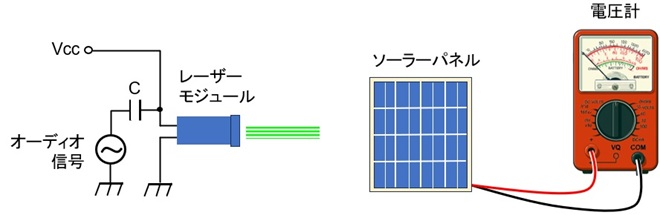 図1、図2の何れの方法でも送信側の被変調波の信号を捉えることができませんでした。図1では、ソーラーパネルにレーザー光線が照射されているときは、ソーラーパネルは発電し、電圧計の針は振れました。図2では、スピーカーから音が全く聞こえないことからレーザーモジュールから照射される光に変調が掛かっていないことが分かりました。