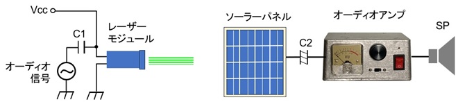 今回、レーザーモジュールを前回の赤色からグリーンのレーザーを放つレーザーモジュールに入れ替えたところ変調が掛からなくなったためソーラーパネルで受けた後の信号の状態等を調べました。このときの実験回路を図1、図2に示します。