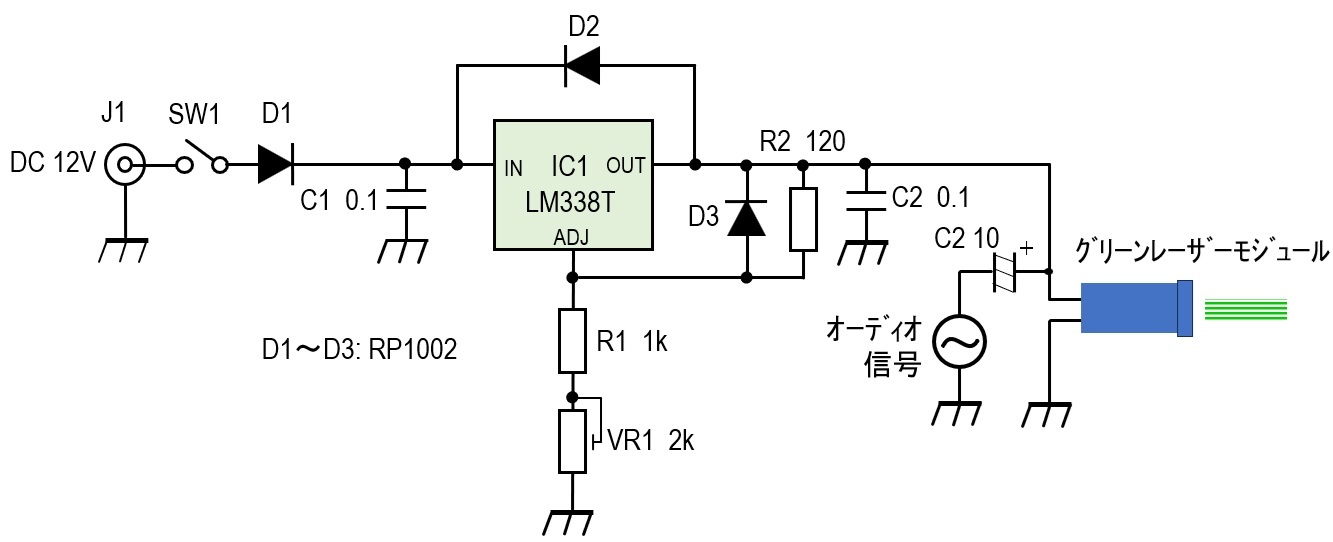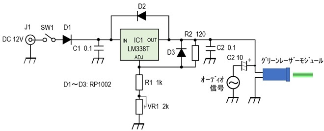 今回使用したグリーンのレーザー光線を発するレーザーモジュールの定格電圧は3~5Vです。よって5Vの三端子レギュレーターの出力にシリコンダイオードを1本通して4.3Vをレーザーモジュールに印加しました。違いはこの電圧だけでしたが、全く変調が掛かりませんでした。