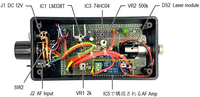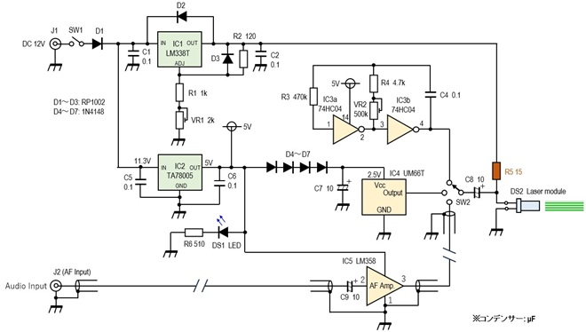 回路図のR5(15Ω)は多くのレーザーモジュールでは、なくてもVR1で電圧を調整するだけで変調はかかりましたが、レーザーモジュールによってはここにこの抵抗を挿入することでより深い変調が掛かりました。