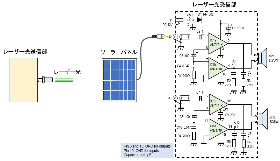 レーザーモジュールの焦点を調整せず、ソーラーパネルの面積以上に広がったレーザー光を照射すると、スピーカーから鳴る音は非常に小さかったです。できるだけ小さな音を大きくして長距離通信を行いたかったということもあり、受信部は文末に示すBTLアンプとしました。