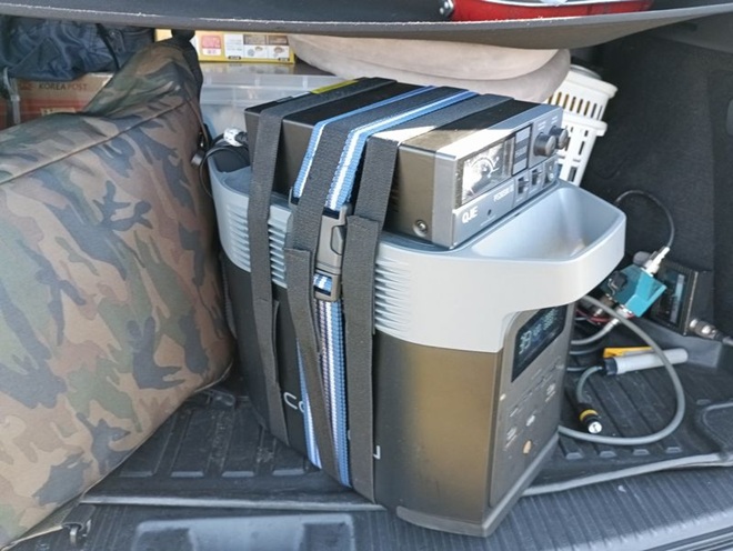次にポータブル電源のAC100V出力を使い、安定化電源で13.8Vを得る方法です。これなら十分な容量のモデルを選ぶことができます。これぞ本命かと思い、すでにこの方式を試している移動専門無線家の方の移動運用中を襲撃(笑)して使い心地など聞いてきました。曰く容量は十分ですが、やはり特定の周波数でキャリアがあったり、フロアノイズが上がるなどの影響はあり無視できない時もあるということでした。