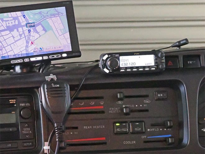 運転席にはID-4100が取り付けられています。そして運転席の後ろには大きなラックがあって、IC-7200M、IC-7000M、ID-1と日本赤十字社の業務用無線機を配置。さらにアンテナ切り替え器やアンテナチューナー、拡声器なども組み込まれていました。