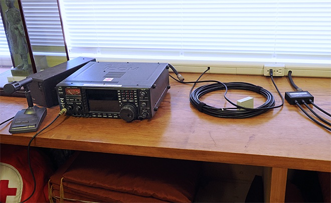 屋上に行く前に、途中階にある和室を見せていただきました。一見すると普通の大広間のような感じですが、実はここからも無線のオペレートができるように、無線機が常備され、屋上にあるアンテナからのケーブルが引き込まれていました。