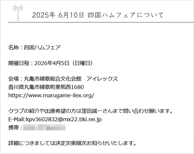 - ・備考: 今春、初の「四国ハムフェア」が香川県で開催される。現時点では主催するJARL四国地方本部のホームページに短い告知が出ているだけだが、開催が近づくと詳細の案内が始まると思われる。新たなハムフェアに注目したい。