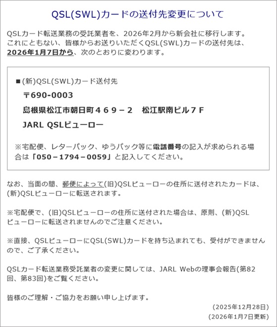 なお、当面の間、郵便によって(旧)QSLビューローの住所に送付されたカードは、(新)QSLビューローに転送されます。
