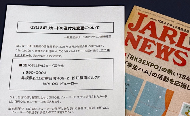 JARLは2025年12月末、公式サイトのJARL Webで、新しいQSLビューローを島根県松江市朝日町469-1(松江駅南ビル7階)に設置することを発表した。