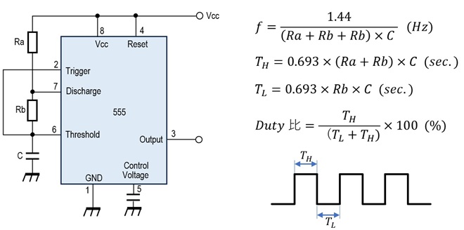 出力信号は正弦波ではありませんが、デューティ比はできるだけ約50%に近づけるようにします。図3に示す波形ではTH=TLの時が50%となります。デューティ比は、計算上Raが0(ゼロ)Ωの時が50%となりますが、555のスペック上Ra≠0としない条件があるので、Rbに対してできるだけ低い抵抗値とします。