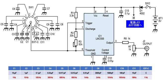 IC1 pin3から出力される信号の周波数は、C1~C11とEXT-Cに接続されるコンデンサの値で決定します。図4の回路図に示した、ロータリースイッチのポジションとコンデンサの容量、また発振周波数の対応表は公式で求めた計算値であり、実際はこのとおりの周波数が正確に出力されるものではありません。