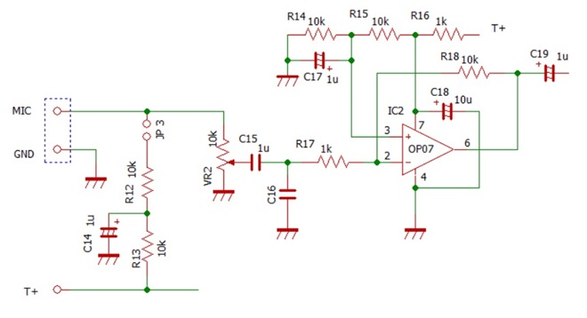 さすがにオペアンプのµA741は入手難ですので、図2のように秋月電子で入手可能なOP07Nを使いました。ピンアサインは同じですので、どちらでも同じように使えます。他に使えそうなオペアンプもありそうです。ゲインはダイナミックマイクが想定されていたのではないでしょうか。コンデンサマイクを使うとゲインが大き過ぎるので、入力の半固定VRを下げる事になります。ほとんど極限まで下げる事になり、S/Nが悪くなってしまいました。そこでコンデンサマイクに合わせてR18を10kΩに変更し、ゲインを下げました。これで半固定VRは適度な位置になり、調整もやりやすくなります。ダイナミックマイクを使うのであれば、R18を100kΩに戻せば良いはずです。私はコンデンサマイクしか使った事がありませんが、感度は20dB程度異なります。また、使用状況にも左右されますので、最適なゲインは本人が決めるしかありません。一応この値で半固定VRの調整範囲に入ると思います。また、コンデンサマイクを使う時の電源は自分で付ける必要がありました。そこで、JP3のジャンパーで電源の有無を選べるようにしました。もちろん不要であれば省略して下さい。