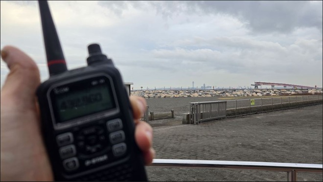 この日のお台場海浜公園は時折、突風が吹き荒れ、自身の身体も吹き飛ばされそうになり、また、砂浜の砂も舞い上がるほどでした。ここでの運用場所は案内所・マリンハウス3階の展望台です。1時間ほど運用しましたがバンド内には数局の信号が聞こえる程度でした。CQを出し始めると地元局からのコールバックがありました。その後、信号が強めのCQ局に応答し、何とか2局の交信実績ができました。