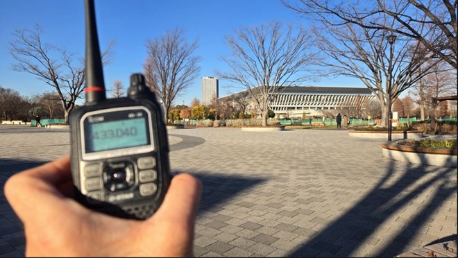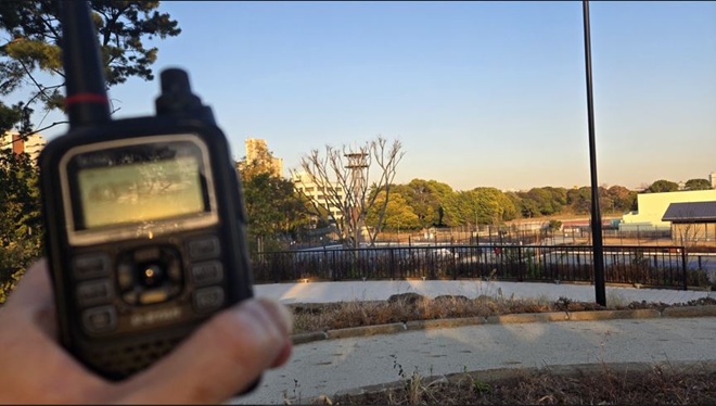 - (イ)その後、向かったのは辰巳の森海浜公園です。「晴海埠頭」バス停から都営バス「錦13甲」系統で「豊洲駅前」バス停まで行き、都営バス「門19甲」系統を乗り継ぎ、現地に15時過ぎに到着しました。バンド内をワッチすると先ほどとはうって変わり閑散としていました。「これはもしかすると、ここまでやって来たのにボウズか」と考えながらCQを出しました。15分ほど経過してから強い信号でこちら呼ぶ声が聞こえました。「ありがたい!」地元局からのコールバックがあり、この地での交信実績ができました。滞在時間30分ほどで2局と交信でき、ほっとして路線バスに乗り込み帰路につきました。