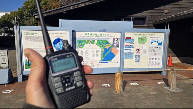 - (ア)スタンプ10個目を押印するための最後の場所となったのが東京港野鳥公園です。今回は路線バスではなく自転車を使用して移動運用を行いました。まずはスタンプ台のある管理事務所に行き、最終10個目のスタンプを押印し記念品を頂きました。その後、管理事務所周辺にベンチを見つけ、移動運用を開始しました。周囲は樹木に囲まれているので交信できるか不安がありました。バンド内をワッチするとQRVしている局はいるようです。ID-31PLUSを斜めに傾けたりするとS2~3で聞こえる状態です。とりあえず、かすかに聞こえる数局にコールしましたが応答はありませんでした。