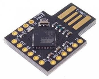 USBデバイス化には、HIDデバイスとしての使用例が多く、過去の動作実績も豊富なATmega32u4を採用しました。ATmega32u4を採用したマイコンボードはいくつか種類がありますが、ケースに収めやすいように、USBコネクタ一体型の小型マイコンボードを採用しました。