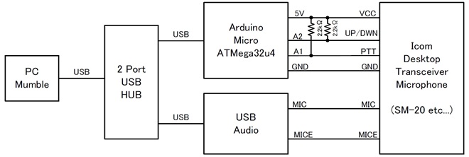 そこで今回は、「アマチュア無線機の固定機用マイクやハンディ機用スピーカーマイクを、そのまま Mumble の操作に使えないだろうか?」というアイデアから、実際にインターフェースを製作してみました。