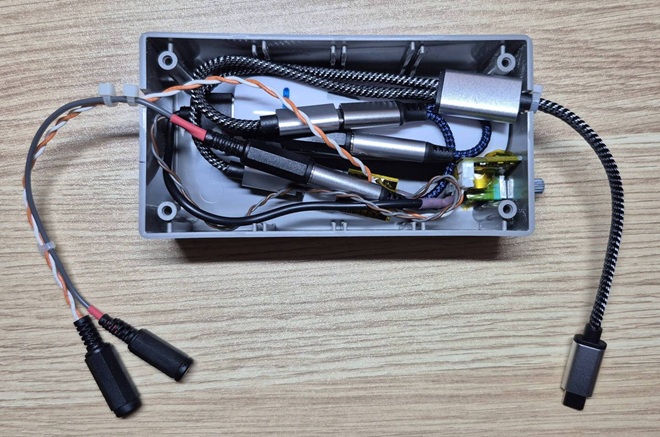 スマートフォンからオーディオアンプの電源を取ることは難しいため、小型USBモバイルバッテリー(Tango EL0092)をアンプ専用電源としてケースに内蔵しています