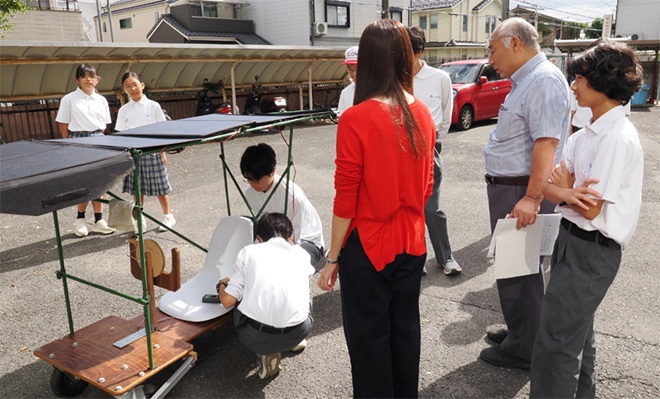 校門のすぐ先、校舎の前の空きスペースで、科学技術部の皆さんが何かを作っています。木と細いパイプで組み立てた屋台? お祭りのお神輿? いえいえ、近づいてみるとタイヤと椅子がついていて、屋根には青くキラキラしたソーラーパネルが乗っています!