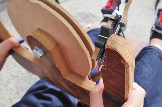 目の前にあるハンドルは木製(不要になった机を加工したものだそうです)で、ワイヤーで前輪につながっています。この舵取りの構造は良くできています! そしてハンドルの右上にはスライド式のレバー(ボリューム)がついていて、これがアクセル代わりになるのですね!