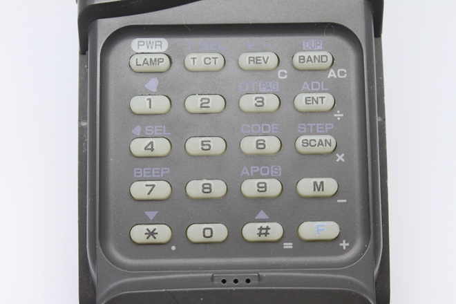 電源を入れてみると、VHFバンドのメインチャンネル周波数が表示されました。取説を読むと、メモリーチャンネルやスキャンなど、ハンディー機の機能が一通り搭載されているようです(受信音が出ず、構造上ダミーロードを接続出来ないため送信動作は確認していません)。時計に加えて電卓機能もあり、遊び心が感じられます。