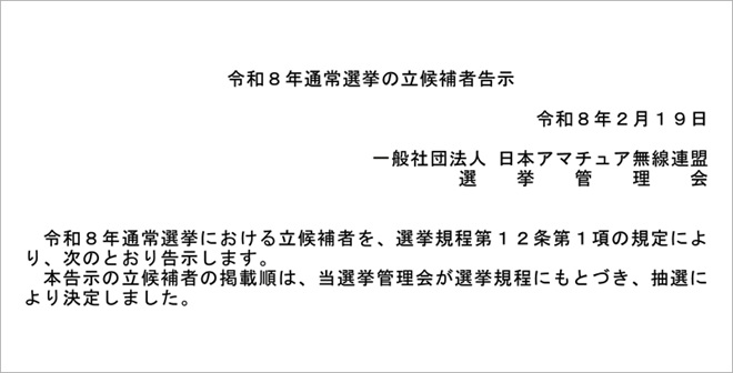 2月19日にJARL Webサイトに掲載された「令和8年通常選挙の立候補者告示」より