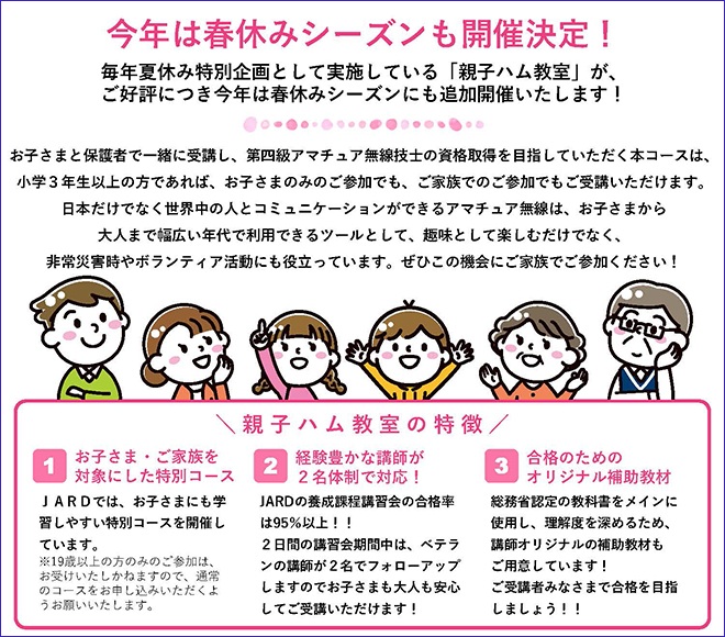 一般財団法人 日本アマチュア無線振興協会(JARD)は、3月28日(土)、29日(日)に「第四級アマチュア無線技士養成課程講習会・親子ハム教室(ファミリーコース)」を開催すると発表し、申込みを受付けている。親子ハム教室は毎年夏休み特別企画として開催され、電波の基礎や無線通信の仕組みを、子どもにも理解しやすい形で学べる内容となっており、今年は春休み期間にも追加開催されるという。