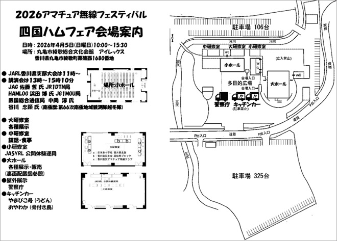 JARL(一般社団法人 日本アマチュア無線連盟)四国地方本部の四国ハムフェア実行委員会は、四国4県(愛媛、香川、高知、徳島)JARL支部との共催で、2026年4月5日(日)に香川県丸亀市の丸亀市綾歌総合文化会館(アイレックス)で、「四国ハムフェア」を初開催する。60以上の企業、団体、個人がブースなどの出展をするほか、各種講演や抽選会などが予定されている。