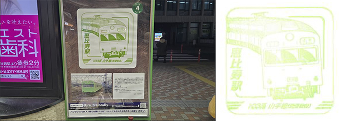 左: 恵比寿駅スタンプ台 右: 恵比寿駅103系