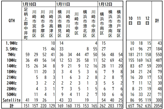 運用日、QTH、バンド別のQSO数を表1に示します。同じQTHで7~50MHz帯の8バンドQSOができた局もみられました。北日本は悪天候で、運用できなかった固定局も多かったと思われ、全体のQSO数は低調でした。V/UHF帯を運用したら、違った結果になったかもしれません。