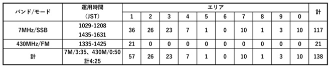 今回の移動運用での交信局数は7MHz帯が117局、430MHz帯が21局の合計138局でした。7MHz帯では最も多く交信できたのは地元1エリアの36局、続いて2エリアの26局、そして3エリアの23局という順番でした。