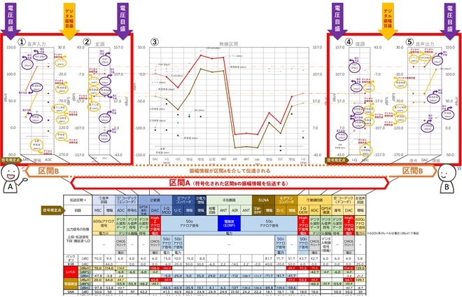 前回に引き続き、図1は第16話の図5「一気通貫で作成したレベルダイヤグラム」に、今回取り扱う「①音声入力」「②変調」「④復調」「⑤音声出力」の各区間の縦軸の読み取り方を示したものです。ここに書かれた一連のグラフのうち赤枠で囲った部分「①音声入力」「②変調」と「④復調」「⑤音声出力」の縦軸はそれぞれ両端が電圧[dBµV]、中央がデジタル振幅[dBFS]です。なお[dBFS]の“FS”は第3話の表1に示したとおりFull Scaleの略です。つまり①~②の区間と④~⑤の区間はデジタル信号処理のブロックで、入出力をアナログ電圧でインタフェースしていることが判ります。ここでは塗り潰されているマーカと実線はデジタル振幅(dBFS)、塗りつぶされていないマーカと破線は「③無線区間」と同じく電圧(dBµV)のプロットです。どちらの縦軸を参照すれば良いかはデータラベルに記載されている単位を見て判断します。
