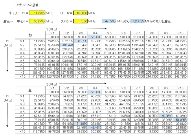 使い方ですが、キャリアの周波数をf1として黄色のセルに入れます。ここでは11.2735MHzとしています。LOの周波数をf2として黄色のセルに入れます。ここでは3逓倍を考えて13.0MHzにしています。すると、それぞれ10倍波までの和と差を全て計算します。次に目的とする中心周波数に50.235MHz、スパンを5MHzと記入します。すると47.735~52.735MHzの範囲、つまり近接スプリアスとなりうる周波数のセルが薄いブルーになります。スパンの周波数は適宜変更して下さい。f2の×3にある一番上の行が取り出したい周波数の50.2735MHzになります。これはスプリアスではありませんが、薄いブルーになるのは仕方ありません。もちろん、どこまで高調波の影響があるのかは、その場合によって異なるのでしょう。とりあえず10倍波まで全部出ますので便利です。