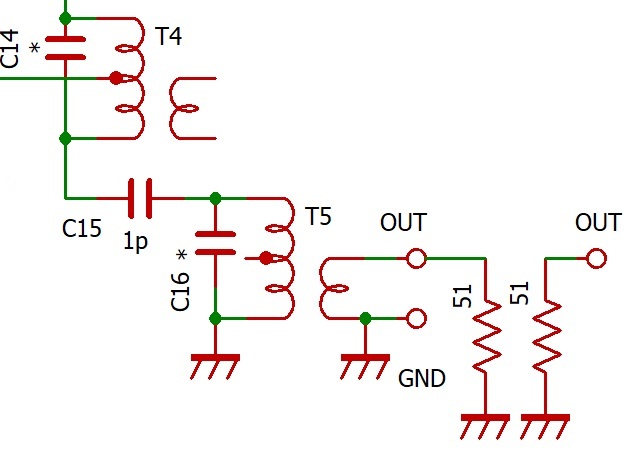 私的にはSi5351Aを使って作りますので、前述のようにトランシーバ用としてVXOを使うつもりはありません。そこで50.300MHz表示のオーバートーン用水晶を基本波で発振させ、3逓倍しました。そして図2のように追加回路で出力レベルを下げて、SGとして使えるようにしてみました。51Ωを並べて、僅かに結合した信号を出力しようとするものです。51Ωを使いましたが、47Ωでも56Ωでも同じです。50Ωが理想ですが、それ程シビアな使い方ではありません。これで受信調整用の簡易SGになります。