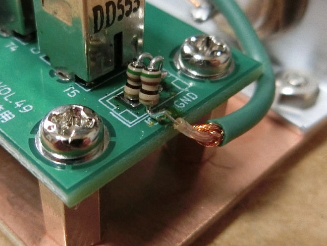 この51Ωの部分は基板外になります。写真6のように抵抗を少々無理に2つ付けています。コネクタ端子に終端する51Ωを付け、その横に出力を取り出す51Ωを配線しました。コネクタは使えないため、極細の同軸0.8D-QEVを直接ハンダ付けしています。写真では隠れていますが、同軸のシールド線側は基板裏でアースにハンダ付けしています。